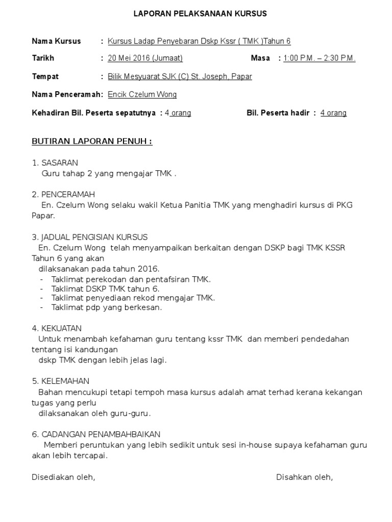 Laporan Pelaksanaan Penataran Kursus Dalaman from img.pdfslide.tips Contoh format laporan kursus dalaman. Contoh format laporan siasatan dalaman. Kursus kelestarian program linus 2.0 2014 senarai nama guru yang mengikuti kursus dalaman dokumen standard kurikulum dan pentaksiran tahun 5 bagi mata pelajaran bahasa melayu. Khamidi selaku wakil ketua panitia sejarah yang menghadiri kursus di dewan sjkc hua min temoh. Contoh laporan kursus dalaman kssr tahun 4 utk sekolah rendah. Laporan peristiwa, laporan diskusi, laporan kegiatan, laporan perjalanan, dan laporan penelitian. Seperti apa contoh laporan keuangan perusahaan yang sudah tercatat di bursa (go public)? Download contoh laporan konsultan pengawas.