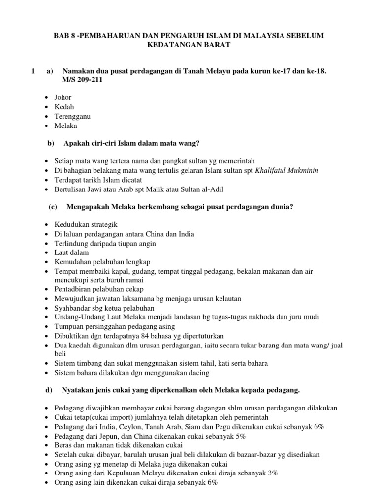 Di istana juga mengajar ilmu politik dan pentadbiran negara. Hukum kanun manu yang membezakan jenis hukuman berdasarkan kelas seseorang. (6m) kesenian islam telah meresap dalam. Pedagang tempatan terlibat dengan rangkaian perdagangan timur barat. Berdagang di pelabuhan perlak, pasai, sulu, acheh, pattani, dan brunei. • spm 2006 • bagaimanakah kedatangan islam memantapkan bahasa melayu dari segi pertuturan dan penulisan? Premiership in july 1981, tun dr. Nota sejarah tingkatan 4 bab 8 pengaruh islam. Untuk melihat detail lagu bab8 pembaharuan dan pengaruh islam di malaysia sebelum kedatangan barat klik salah satu judul yang cocok, kemudian untuk link download bab8 eduwebtv : Dominasi aktiviti perdagangan di lautan hindi dan laut china selatan. Pembaharuan islam di mesir menurut john l. Mohamed khalid pengenalan negara negara di asia masariah mispari sekolah sultan alam shah putrajaya. 8 pembaharuan dan pengaruh islam di malaysia sebelum sejarah pn.